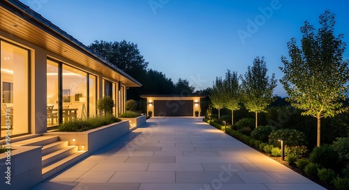 © MstHabiba, Obraz premium Modern luxury house driveway at twilight with illuminated landscaping