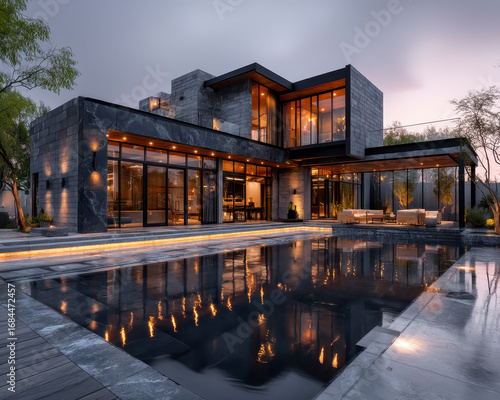 © K-Signature, Obraz premium Modern luxury house with large glass windows and outdoor pool reflecting warm lights at dusk, surrounded by trees and elegant outdoor seating area creating serene atmosphere