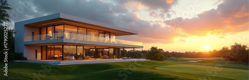 Obraz premium Modern luxury house with large windows sits on green golf course during golden hour sunset. Elegant residence offers panoramic view of fairway trees and orange sky. Peaceful evening scene.