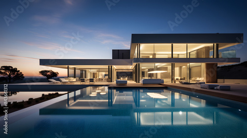 Fototapeta premium Modern Luxury House with Pool and Evening Lighting
