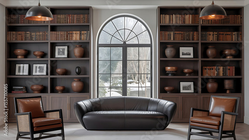 © creative.vector, Fototapeta premium Modern Luxury Living Room: Black Leather Sofa, Dark Wood Bookcases, and Earthy Decor.