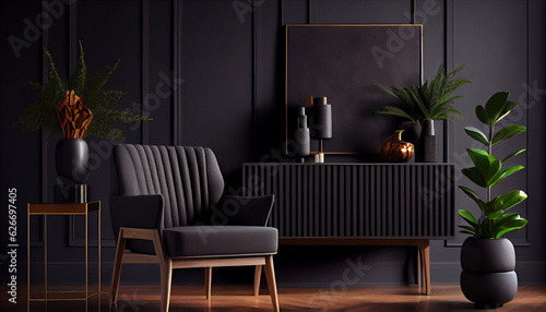 Fototapeta premium Modern luxury living room interior background, living room interior mockup, interior with black walls, dark interior of living room with black wall, chair, and wooden console, Ai generated image