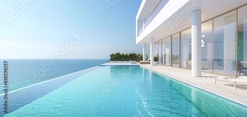 Fototapeta premium Modern luxury oceanfront villa with infinity pool and stunning sea view on a sunny day. Perfect for holidays and relaxation.