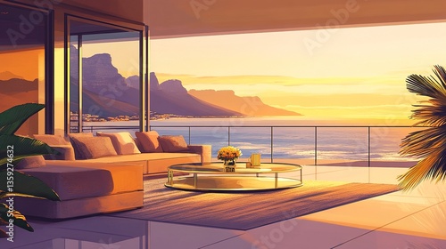 © THUA, Fototapeta premium Modern luxury patio in Cape Town, twilight ocean view framed by sleek glass walls, plush sofas, gold coffee table glinting in soft evening light