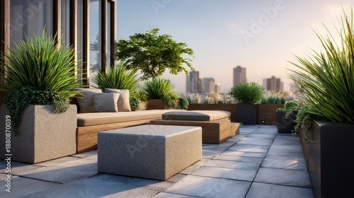 © Marina, Naklejka premium Modern Luxury Rooftop Terrace with City Skyline View