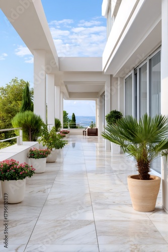Naklejka premium Modern luxury terrace with marble floor and panoramic view