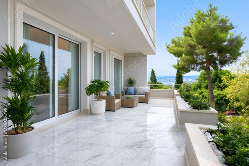 © kardaska, Naklejka premium Modern luxury terrace with sea view and outdoor furniture