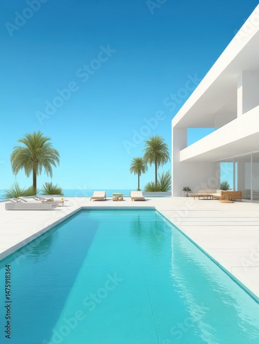 Fototapeta premium Modern luxury villa with pool and ocean view in tropical paradise, showcasing minimalist architecture and serene atmosphere, sunny day