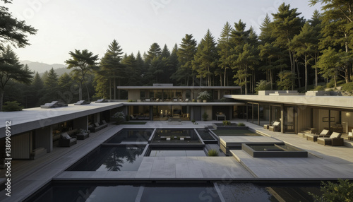 Fototapeta premium modern luxury villa with spacious courtyard and pool, surrounded by tall trees and serene nature, offers tranquil retreat. minimalist design and open spaces create harmonious blend with