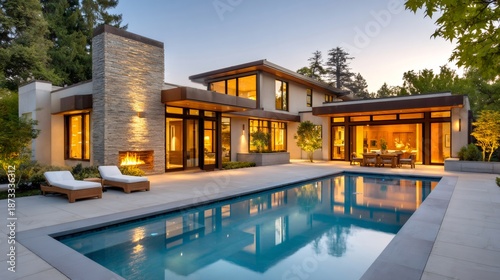 Naklejka premium Modern luxury villa with swimming pool at twilight