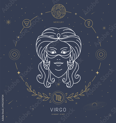 © annbozhko, Naklejka premium Modern magic witchcraft card with astrology Virgo zodiac sign characteristic. Vector illustration