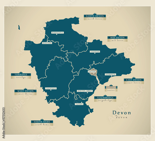 © Ingo Menhard, Fototapeta premium Modern Map - Devon county with districts and labels UK