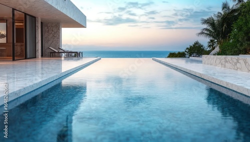 Fototapeta premium Modern marble terrace with infinity pool overlooking calm ocean view during sunset with lounge chairs and lush greenery