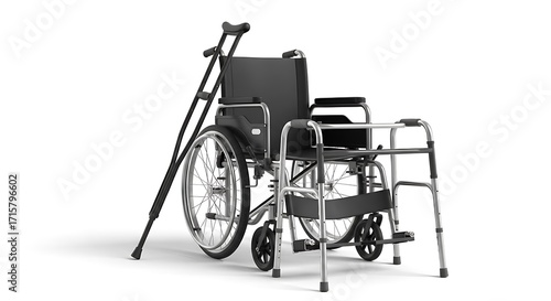© berdoa, Fototapeta premium Modern medical equipment, including a wheelchair, crutches, and a walker, is presented against a plain white backdrop.