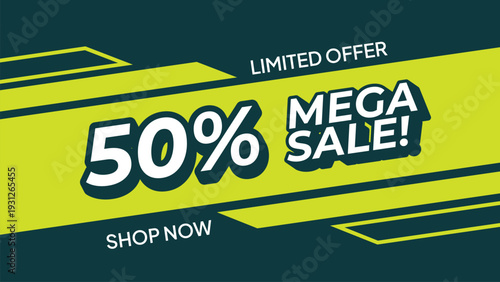 Fototapeta premium Modern mega sale promotional banner with green geometric background, and bold typography.
