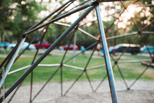 Fototapeta premium Modern metal climbing dome on a playground, geometric jungle gym for children, vibrant outdoor play area, safe climbing structure, active kids having fun in the park