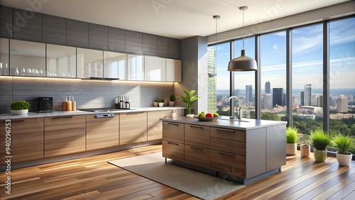 Fototapeta premium Modern minimal kitchen room interior with cabinets, City view window