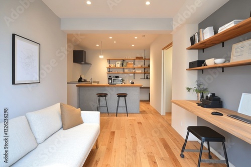 Fototapeta premium Modern minimalist apartment interior with open plan living, kitchen, and workspace.