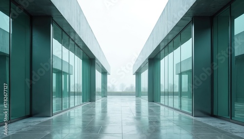 © Pete, Fototapeta premium Modern minimalist architectural hallway features concrete walls, teal glass panels. Empty outdoor passage reflects clean lines, suggesting future tech, innovation. Grey hazy sky visible over bare