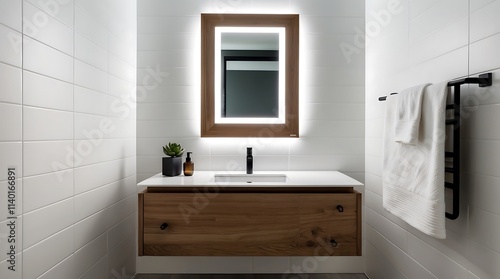© Eidoran, Fototapeta premium Modern Minimalist Bathroom Design: Sleek Vanity, Illuminated Mirror, and Heated Towel Rail