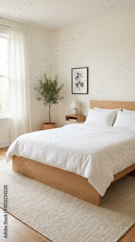 Fototapeta premium Modern Minimalist Bedroom with Natural Light and Plant Decor