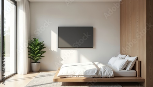 © Vadym, Obraz premium Modern minimalist bedroom with natural light streaming through large windows, creating serene atmosphere. Features low wooden bed, white linens, plant, wall-mounted screen, embodying smart home