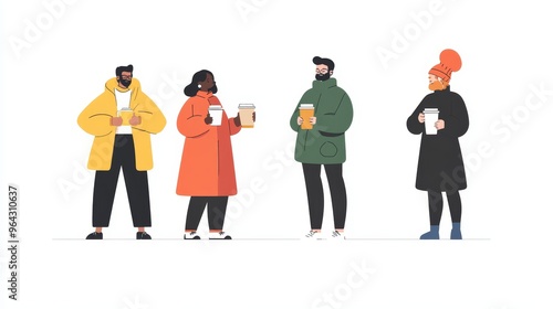 Naklejka premium Modern, minimalist characters hold warm beverages in cups and takeaway...