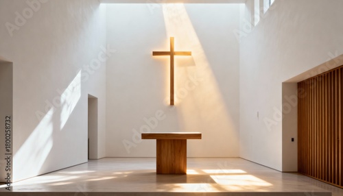 Naklejka premium Modern minimalist church interior with a wooden cross and altar. A beam of...