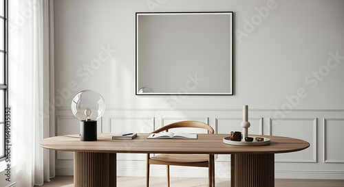 Obraz premium Modern minimalist dining room with oval wooden table and abstract art