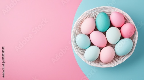 © PalaG, Fototapeta premium Modern Minimalist Easter Basket Filled with Vibrant Colored Eggs