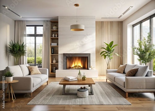 © Supittra, Fototapeta premium Modern Minimalist Fireplace Mantel with Clean Lines and Neutral Decor in a Bright Living Space
