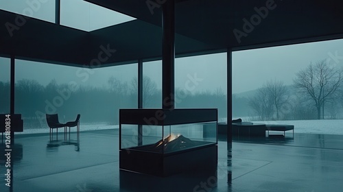© Robert, Fototapeta premium Modern Minimalist Home Interior with Fireplace and Winter View