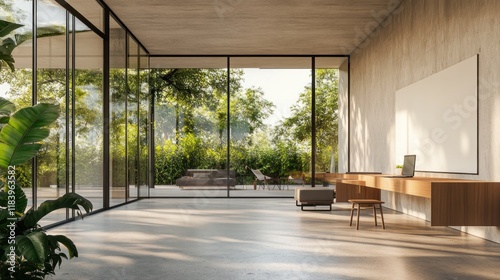 © Fenny, Obraz premium Modern minimalist home office with large windows overlooking lush garden.