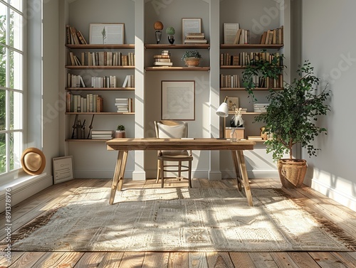 © frank29052515, Fototapeta premium Modern Minimalist Home Office with White Desk, Chair, and Greenery in 3D Rendering