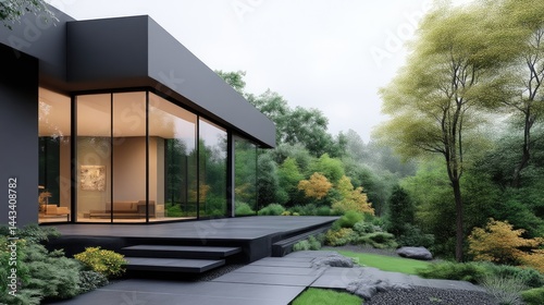 © Bella, Naklejka premium Modern, minimalist home with large glass facade overlooking a lush garden. Exterior featuring dark gray walls and a spacious deck