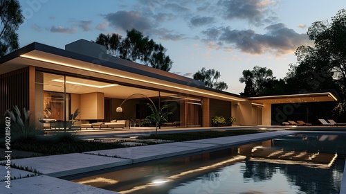 Obraz premium Modern Minimalist Home with Swimming Pool and Outdoor Lighting
