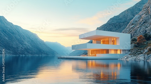 Fototapeta premium Modern minimalist house on a lake, nestled between mountains