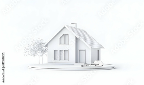 Fototapeta premium Modern Minimalist House with Key on Round Base Surrounded by Trees