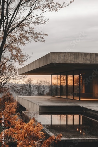 Obraz premium Modern Minimalist House with Large Glass Windows and Reflective Pool in Autumn Setting