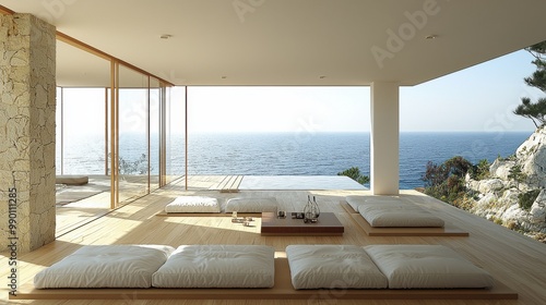 © Рудой Максим, Fototapeta premium Modern minimalist interior design of a coastal home overlooking the ocean on a sunny day with ample natural light and open space
