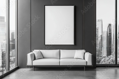 Fototapeta premium Modern minimalist interior featuring a blank canvas, a white sofa, and city view