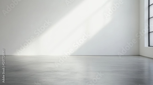 © AbstractAI, Fototapeta premium Modern minimalist interior space with blank white wall and sunlight shadows on polished gray concrete floor, spacious and uncluttered design.