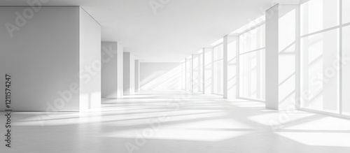 Obraz premium Modern minimalist interior space with white walls and large windows casting...