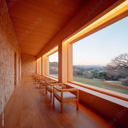 Obraz premium Modern minimalist interior with wooden benches and large windows overlooking...