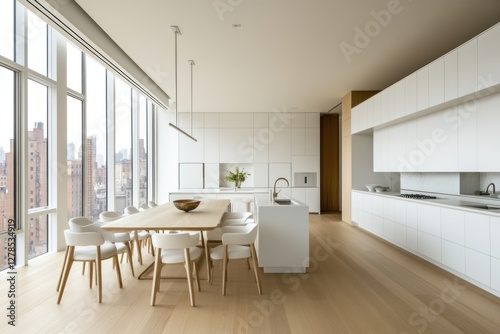 Fototapeta premium Modern minimalist kitchen and dining area with city view.