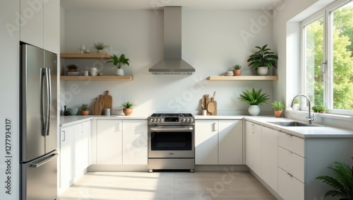 © Nova, Fototapeta premium Modern minimalist kitchen design featuring stainless steel appliances and light wood shelving