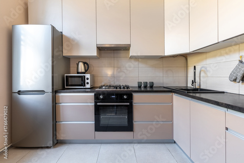 © Dzmitry Halavach, Fototapeta premium Modern Minimalist Kitchen with Beige Cabinets and Appliances
