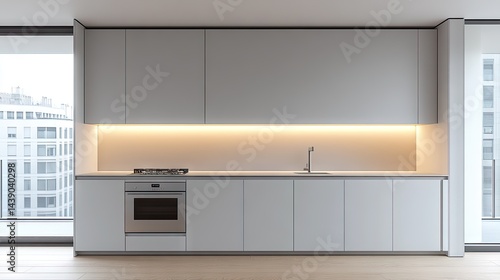 © mahir, Fototapeta premium Modern minimalist kitchen with city views, illuminated by soft light.