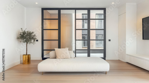 Fototapeta premium Modern minimalist living room design featuring a sleek couch and elegant decor elements