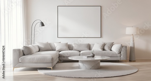 Fototapeta premium Modern Minimalist Living Room Design Large Sofa, Marble Coffee Table Blank...